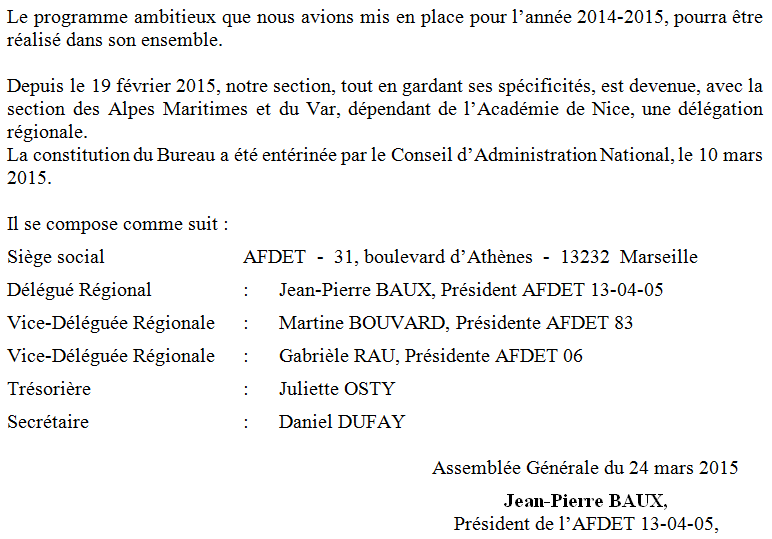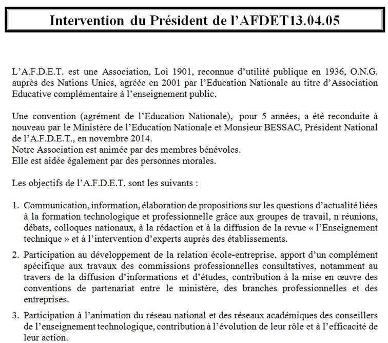 - Aide à la préparation et participation de nombreux membres de l’AFDET (qui parraine cette manifestation) à la Journée Interprofessionnelle du Lycée CELONY à Aix-en-Provence, qui aura lieu le 23 avril 2015.