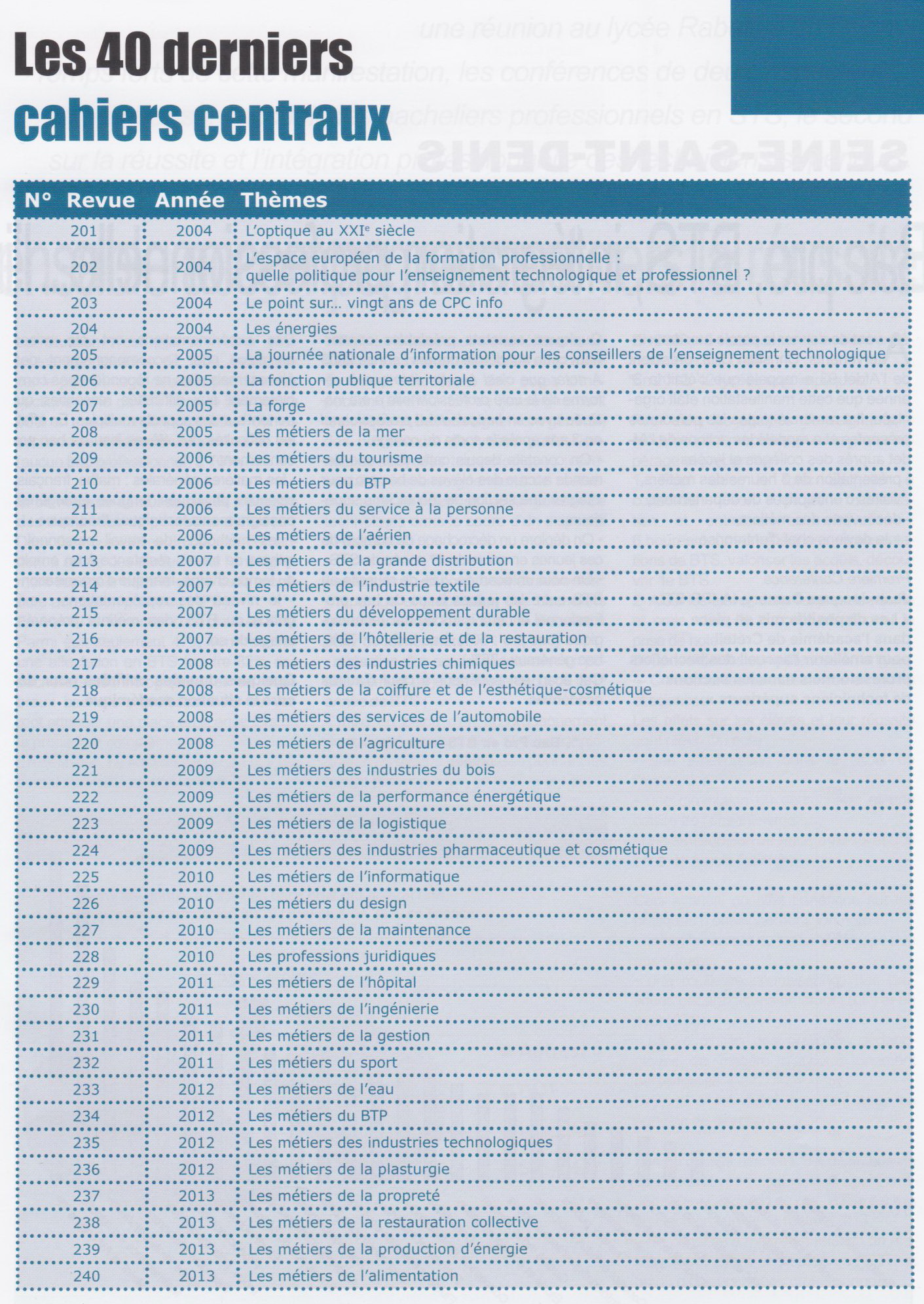 LISTE DES FILIERES PROFESSIONNELLES TRAITEES DANS LES CAHIERS CENTRAUX |